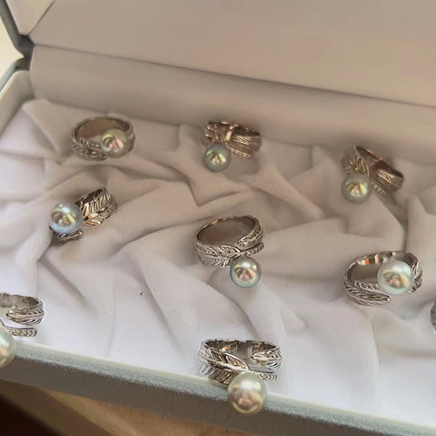 Amorwa Sea Pearl Silver Ring Vintage Feather Ring Adjustable Ring